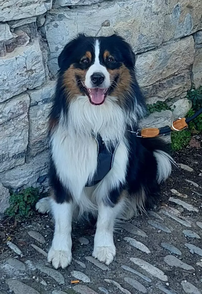Snow, c'est moi, berger australien de 4 ans, je suis curieux, joueur, câlin et j'adooooore le fromage.